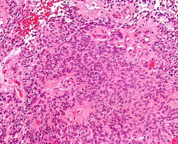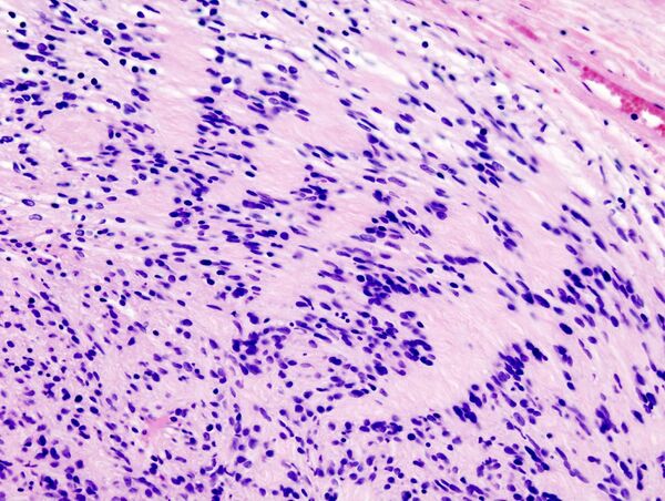 Псевдопалисады это зоны повышенной клеточности, которые окружают очаг некроза опухолевой ткани. Это часто свидетельствует о высокой степени злокачественности опухоли.[8] Часто встречается в глиобластомах.