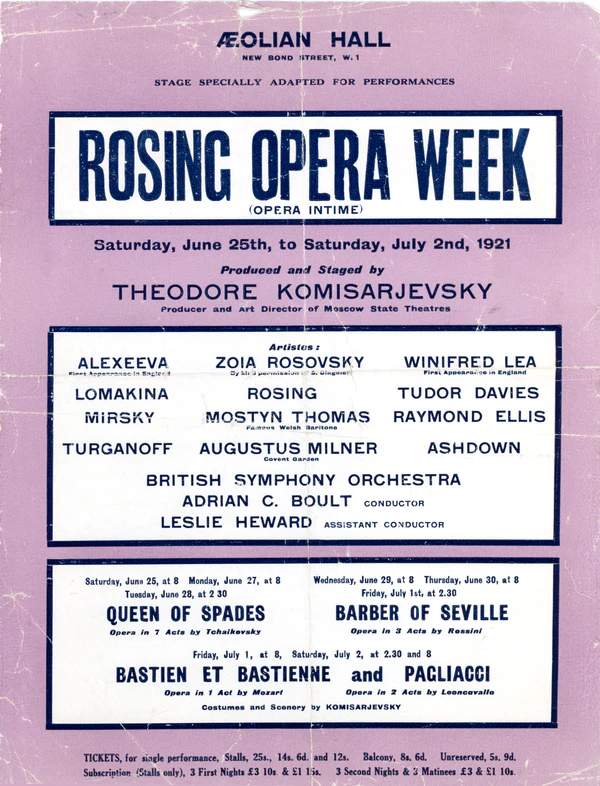 В июне 1921 года, совместно с продюсером Фёдором Комиссаржевским и дирижёром Адрианом Боултом, он открыл сезон Интайм Оперы в лондонском Aeolian Hall[33]. По приглашению Розинга на одном из его спектаклей присутствовала Айседора Дункан[34]. Кроме того, он выступал в Глазго и Эдинбурге.