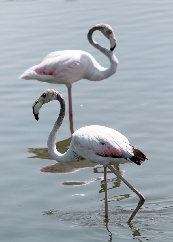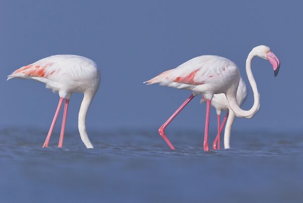 Кормящиеся на разной глубине розовые фламинго