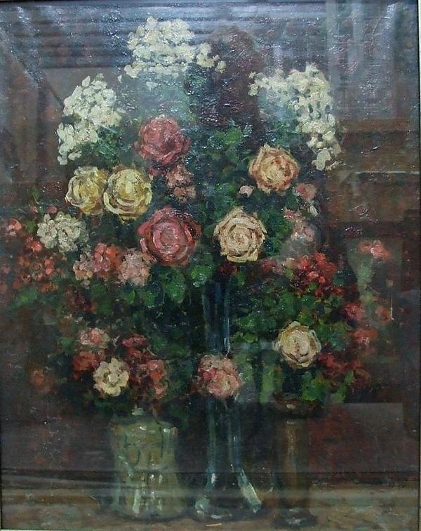 На полотне представлен натюрморт, в центре которого находится узкая голубая стеклянная ваза с букетом красных, жёлтых и чайных роз. В верхней части композиции изображены белые флоксы. Справа располагается низкая зелёная ваза из фарфора с небольшим букетом красных цветов. Слева помещена высокая коричневая ваза с двумя розами и мелкими красными цветами. В работе преобладает красновато-зелёная цветовая гамма.