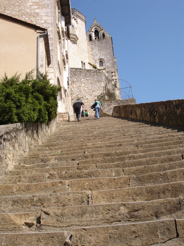 Финальное испытание для паломника в Рокамадуре состояло в том, чтобы стоя на коленях преодолеть 216 ступеней главной лестницы, ведущей в церковную часть городка (где находится семь церквей и двенадцать других построек, которых не коснулись реставрационные работы XIX века). Преодолевшие это восхождение паломники попадают внутрь санктуариев, где они могут оставить различные жертвования в качестве вотивных предметов. Самыми известными предметами остаются оковы освободившихся заключённых, макеты кораблей от моряков, спасшихся в штормах, и, конечно, мраморные дощечки с надписями, прикреплённые к стене часовни в XIX и XX веках.