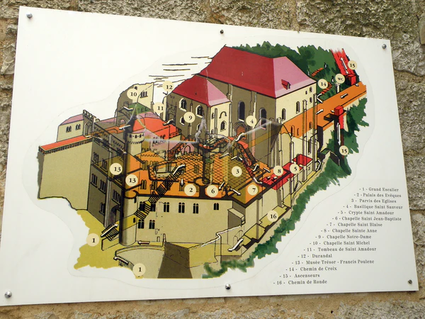 Средневековый городок Рокамадур с искривлёнными улочками сохранил несколько укреплённых ворот (porte Salmon, porte Cabilière, porte de l’hôpital, porte du figuier). Величественная лестница, по которой паломники прежде взбирались становясь на колени (в наше время такое случается реже), ведёт от площади к святилищам — базилике Сен-Совёр (фр. basilique Saint-Sauveur), крипте святого Амадура (классифицирована как объект Всемирного наследия ЮНЕСКО[4]), часовням Sainte-Anne, Saint-Blaise, Saint-Jean-Baptiste, Notre-Dame (где находится статуя чёрной мадонны) и Saint-Michel. Над этим комплексом возвышается дворец епископов Тюля[1]. Дорога крестного пути начинается у замка и проходит до креста крестоносцев, возле которого устроен павильон.
