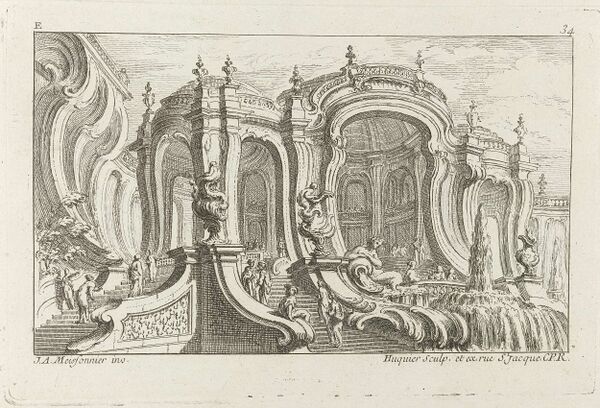 В созданиях этой архитектуры прямые линии и плоские поверхности почти исчезают или, по крайней мере, маскируются фигурной отделкой; карнизы помещаются над карнизами; высокие пилястры, кариатиды и теламоны подпирают ничтожные выступы, фронтоны, чаще «разорванные», увенчиваются вазами, пирамидами, скульптурными фигурами, трофеями. Всюду, в обрамлении окон, дверей, стенных пространств внутри здания, в плафонах и десюдепортах, пускается в ход затейливая лепная орнаментация, состоящая из завитков, маскаронов, цветочных гирлянд и фестонов. При этом обрамляющая и заполняющая функции орнамента часто меняются местами, что ещё более усиливает «моторность» восприятия архитектурной композиции.