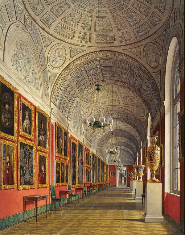 «Особое место в истории портретных галерей императорского дворца занимает Романовская, творцом которой был сам император Николай I. Как и его старший брат Александр I, составляющий списки генералов, чьи портреты предполагалось поместить в Зале воинской славы 1812 года, Николай вникал во все подробности создававшейся по его указу в конце 1840—1850 гг. галереи портретов представителей Дома Романовых в здании Малого Эрмитажа. Для начала велено было составить реестр „всем портретам Высочайших Особ, находящимся в Эрмитаже и во всех императорских дворцах“. Оказалось, в кладовой Эрмитажа 172 изображения; отправлено в Москву — 12; в Гатчину — 3; Английском дворце в Петергофе — 26; в старом дворце −18. 12 декабря 1844 г.»[3]