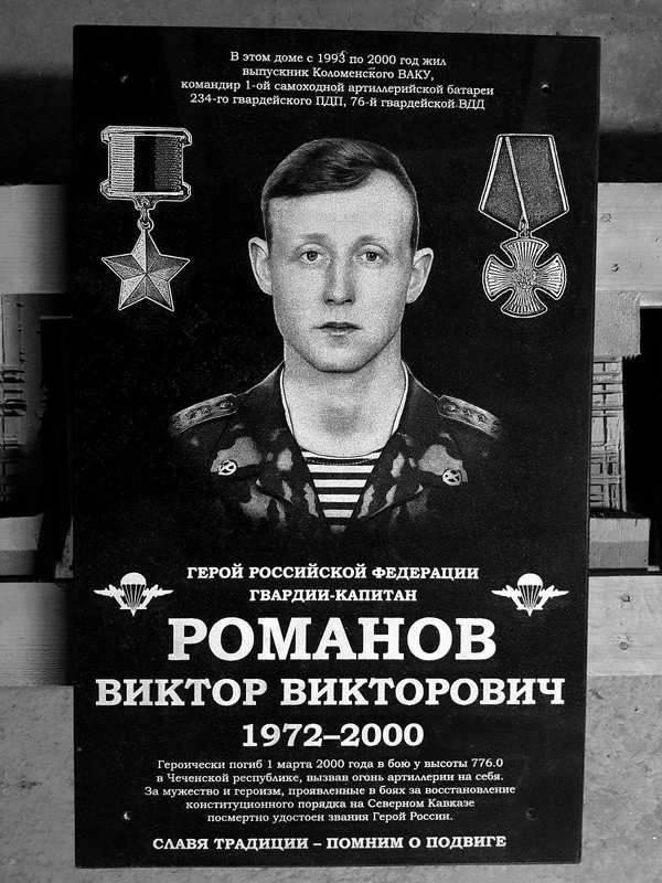 - 22 февраля 2020 года в торжественной обстановке в рамках памятных мероприятий посвященных 20-й годовщине подвига псковских десантников на высоте 776,0, в Коломне на ул. Спирина, д. 6 открыта мемориальная доска Герою Российской Федерации Виктору Романову.