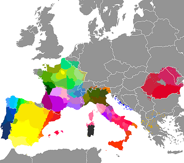 - «Старая Романия» на территории Европы (Италия, Португалия, почти вся Испания и Франция, южная Бельгия, западная и южная Швейцария, основная территория Румынии, Молдавия, отдельные вкрапления на севере Греции, юге и северо-западе бывшей Югославии)