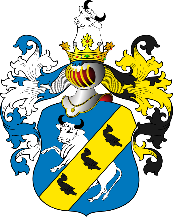 В лазуревом щите серебряный скачущий бык с чёрными глазами, языком, рогами и копытами. На щите золотая перевязь влево, обременённая тремя черными дроздами без клюва и ног.