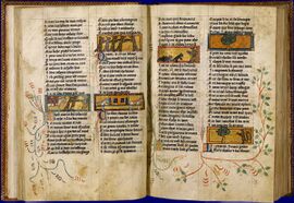 | Поединок Ренара с Изенгримом, миниатюра из поэмы «Renart le nouvel» Жакмара Желе (фр. Jacquemart Giélée), 1290-1300-е гг. | |