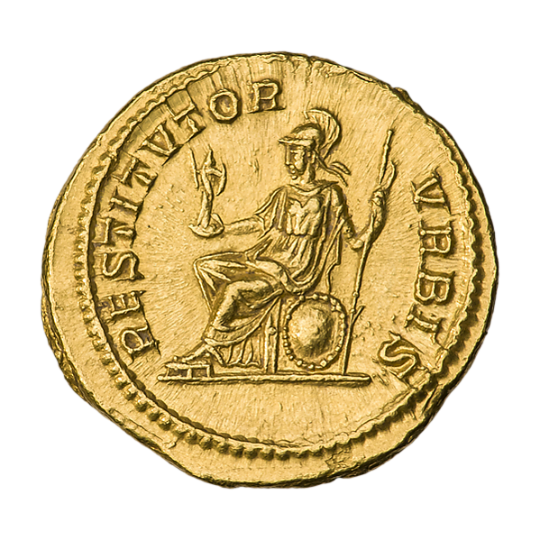 Аверс:Легенда: «SEVERVS PIVS AVG». Голова Септимия Севера в лавровом венке, вправо. Реверс:Легенда: «RESTITVTOR VRBIS». Рома сидит на троне без спинки, влево. В руках палладиум и скипетр, внизу у трона стоит щит. |