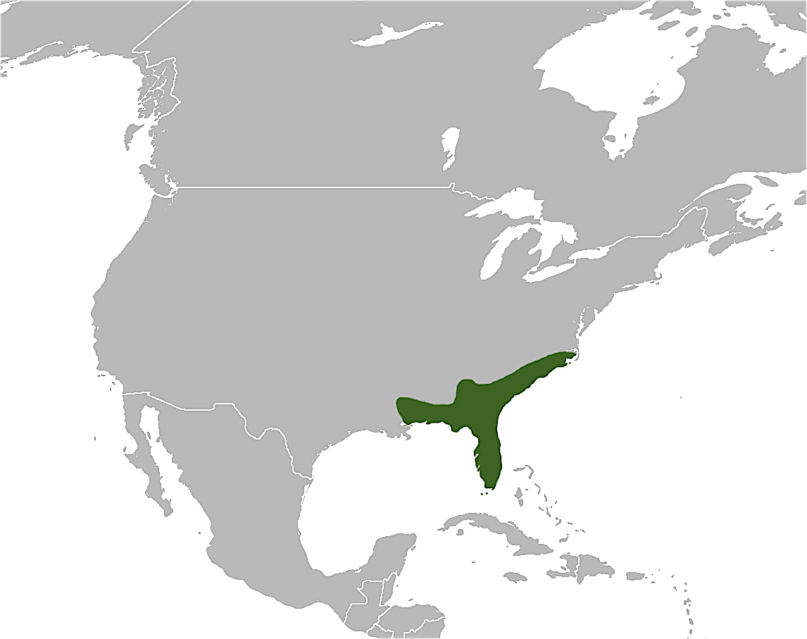 Эндемик Соединённых Штатов Америки. Живёт во Флориде, вдоль побережья проникает на север до мыса Гаттерас, а на запад - до Нового Орлеана.
