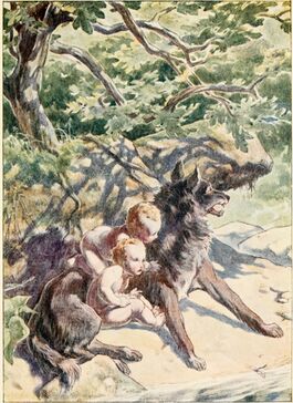 Дед близнецов, царь Альба-Лонги Нумитор, был свергнут собственным братом Амулием. Последний сослал низложенного царя, убил его сына, а дочь по имени Илия или Рея Сильвия сделал весталкой и обрёк таким образом на безбрачие. Тем не менее вскоре девушка забеременела. По самой древней версии, она зачала от бога Марса, по более поздним альтернативным версиям — от какого-то смертного (Ливий пишет о насилии[8]) либо от демона. Амулий хотел казнить племянницу, но прислушался к мольбам своей дочери Анто и ограничился тем, что отправил беременную весталку в тюрьму. Когда она родила двух мальчиков-близнецов, царь приказал бросить младенцев в Тибр. Было время паводка, так что раб, которому это было поручено, оставил корзину с детьми на мелководье; она поплыла было по течению, но зацепилась за ветви смоковницы, посвящённой Румине — богине вскармливания новорождённых. Пришедшая на водопой волчица накормила мальчиков своим молоком, а дятел (птица, посвящённая Марсу) принёс им немного еды в клюве. Свидетелями этого чуда стали царские пастухи, жившие на холме Палатин. Один из них, Фаустул, унёс детей к себе домой[9][10][11][5][12][13].