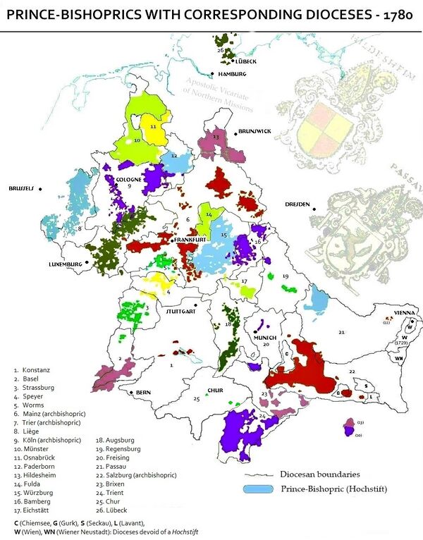 Среди этих государств и территорий церковные княжества являлись уникальными для Германии. Представители Салической и Оттоновской династии использовали аббатов и епископов как агентов Короны, которые в отличие от герцогов были более верными и не могли создать независимые наследственные владения. Императоры увеличивали власть Церкви, особенно епископов, передачей земельных участков и многочисленных гарантий защиты и неприкосновенности, а также широких судебных прав, что способствовало возникновению светских владений епископов (также известны как Hochstift). Немецкий епископ стал «имперским князем» и прямым вассалом императора за свой Hochstift,[5] продолжая заниматься пасторством во вверенной епархии. Личное назначение епископов императором стало причиной пятидесятилетней борьбы за инвеституру XI—XII вв., итогом которой стало ослабление его влияния. Теперь епископы чаще выбирались независимыми кафедральными собраниями каноников, чем назначались императором или папой римским, после чего получали подтверждение своей власти на равных правах со светскими князьями.