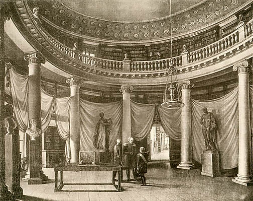 - Фактический основатель Библиотеки М. И. Антоновский, которому принадлежит и первая система классификации, обнаружил, что кражи совершают французские специалисты, служившие в Библиотеке при Шуазёле-Гуфье.