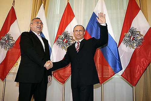 23—24 мая 2007 года Австрию с официальным визитом посетил президент России Владимир Путин[12], который провёл встречи с федеральным канцлером Альфредом Гузенбауэром и президентом Австрии Хайнцем Фишером. Незадолго до прилёта Владимира Путина в Вену официальный визит президента России был омрачён скандалом: плановое интервью австрийскому телеканалу ORF в рамках подготовки к визиту было отложено на неопределённый срок из-за «недружественных репортажей канала в преддверии государственного визита» (имелось в виду намерение канала показать вместе с интервью сюжеты о положении чеченцев в России). Кроме того, не состоялись встречи с корреспондентами немецкого телеканала RTL и двух австрийских газет[13]. В рамках бизнес-форума, параллельно проводившегося в Вене, было подписано около 30 соглашений, меморандумов и контрактов на общую сумму в три миллиарда евро[14]. Кроме того, в районе Зальцбурга состоялось официальное открытие хранилища природного газа объёмом 2,4 млрд кубометров (одна треть от всех потребностей Австрии)[15]. Также была достигнута договорённость о выходе российских энергетических компаний на конечных потребителей в нескольких федеральных землях Австрии[14], продлён контракт на поставки российского газа австрийским компаниям до 2027 года[16].
