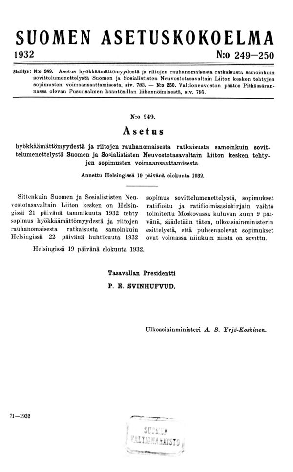 23 августа был заключён Договор о ненападении между Германией и Советским Союзом. По секретному дополнительному протоколу к Договору Финляндия была отнесена к сфере интересов СССР.