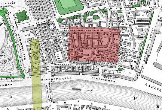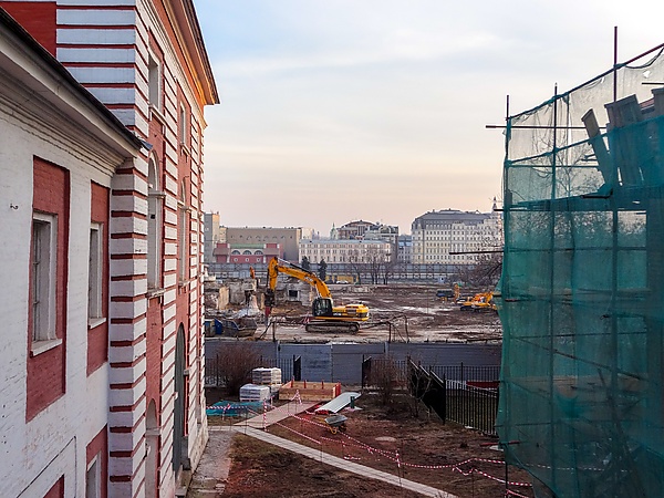 К началу XX века район Зарядья превратился в трущобы. В ходе Сталинской реконструкции Москвы 1930-х годов его значительно перестроили: в 1936—1937 годах снесли ветхую малоэтажную застройку исторического района, в том числе часть Китайгородской стены. В 1934 и 1936 годах провели конкурсы на проект строительства на этом месте здания Наркомата тяжёлой промышленности, но проект так и не был реализован в связи с упразднением ведомства в 1939-м. Вместо него в 1940-м решили возвести второе здание Совета народных комиссаров по проекту архитекторов братьев Весниных, работа по подготовке строительной площадки встала из-за начала Великой Отечественной войны[5][6].