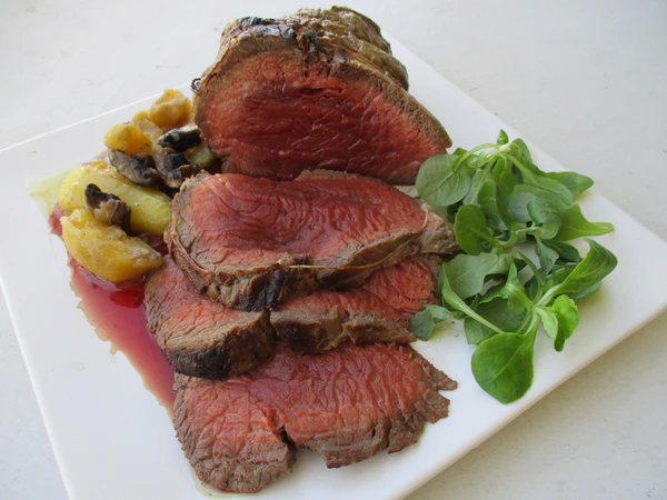 Ростбиф (англ. roast beef — «запечённая говядина») — блюдо из говядины, традиционное национальное блюдо британской кухни. Представляет собой кусок мяса, запечённый в духовке или тушёный в кастрюле[1]. Готовится так, чтобы снаружи мясо было полностью прожаренным, а внутри оставалось с кровью (или розовым). Нарезается тонкими ломтиками и подаётся с овощами, картофелем и мясным соусом[2][3].