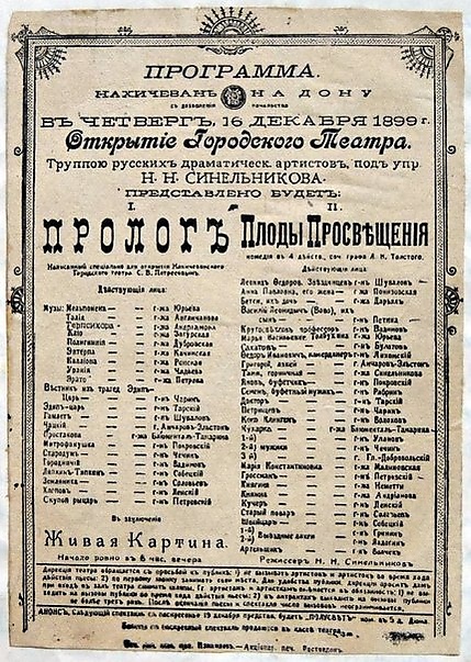 30 марта 1894 года члены Нахичеванского общества любителей драматического искусства подали в городскую думу ходатайство «О сооружении здания городских общественных учреждений и помещения в нём театрального зала и местного коммерческого клуба». Гласные думы поручили городскому архитектору Николаю Дурбаху разработать проект театра. Возведение здания театра длилось четыре года и два месяца. 16 декабря 1899 года состоялось его открытие[3], а отделка интерьеров завершилась лишь к 1907 году[4]. На первом спектакле играла труппа знаменитого театрального деятеля Николая Николаевича Синельникова. Представление состояло из пролога, представившего зрителю постановку-аллегорию, и комедии Л. Н. Толстого в 4-х действиях «Плоды просвещения»[5].