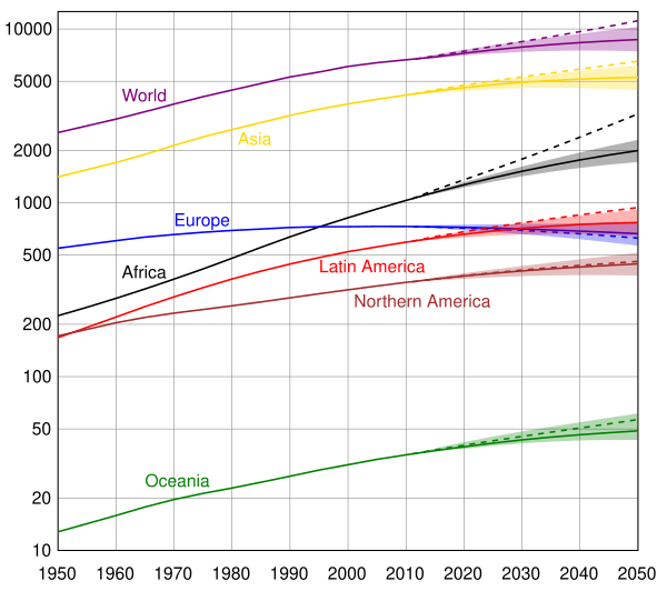 Согласно пересмотренному в ООН прогнозу на 2010 год, по отношению предположений народонаселения, численность населения мира достигнет своего пика в 10,1 миллиард человек в 2100 году, заметно увеличившись по сравнению с 7 млрд в 2011 году.[83] В документе, подготовленном в 2014 году демографами из нескольких университетов и Отделом народонаселения Организации Объединённых Наций, прогнозируется, что население мира достигнет примерно 10,9 млрд. человек в 2100 году и продолжит расти в последующий период.[84] Однако некоторые эксперты оспаривают цифры ООН и утверждают, что в 2020-е годы уровень рождаемости будет ниже коэффициента замещения. Согласно их прогнозам, рост населения будет поддерживаться только до 2040-х годов за счёт увеличения продолжительности жизни, но достигнет пика ниже 9 млрд. к 2050 году.[18]