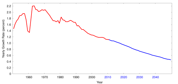 Ежегодное увеличение числа живых людей достигло пика в 1989 году - 88,0 млн. человек, затем в 2003 году оно медленно уменьшилось до 73,9 млн. человек, после чего в 2006 году оно вновь возросло до 75,2 млн. человек. В 2009 году численность населения увеличилась на 74,6 млн. человек.[12] Как правило, в последние десятилетия в развитых странах наблюдается замедление темпов роста населения. Ежегодные темпы роста остаются выше 2% в бедных странах Ближнего Востока и Африки южнее Сахары, а также в Южной Азии, Юго-Восточной Азии и Латинской Америке.[15]