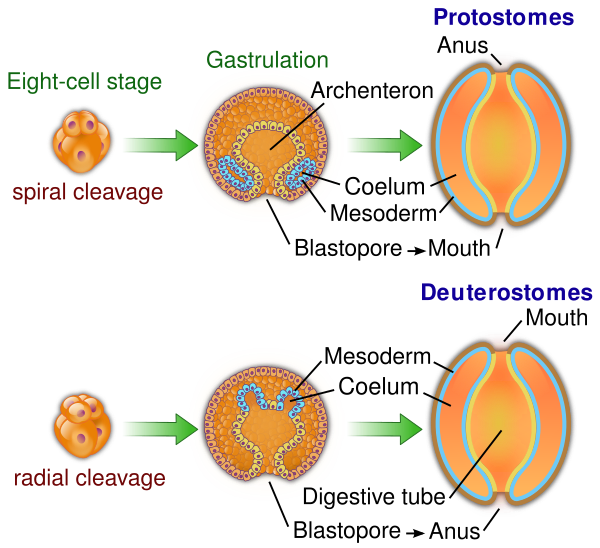 У животных с организмом такого уровня сложности, как у дождевого червя, у эмбриона в случае, если гаструляция осуществляется путём инвагинации, формируется гастроцель — первичная кишка, которая в дальнейшем становится полостью дефинитивного кишечника. У вторичноротых бластопор становится задним проходом, в то время как кишка в конце концов создаёт ещё одно отверстие, которое образует рот. Ранее считалось, что у первичноротых бластопор формирует рот, в то время как задний проход формируется позже как отверстие на другом конце кишки. Более поздние исследования, однако, показывают, что у первичноротых края щелевидного бластопора закрываются посередине, оставляя отверстия на обоих концах, которые становятся ртом и задним проходом соответственно[6].