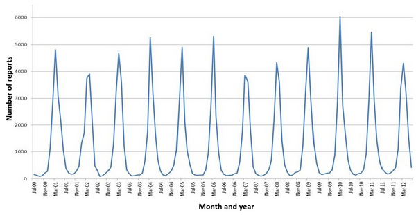 Частота заболеваемости носит чётко выраженный сезонный характер, резко повышаясь в зимние месяцы[21]. В России до 93 %[6] случаев заболевания происходит в холодный период (с ноября по апрель включительно).