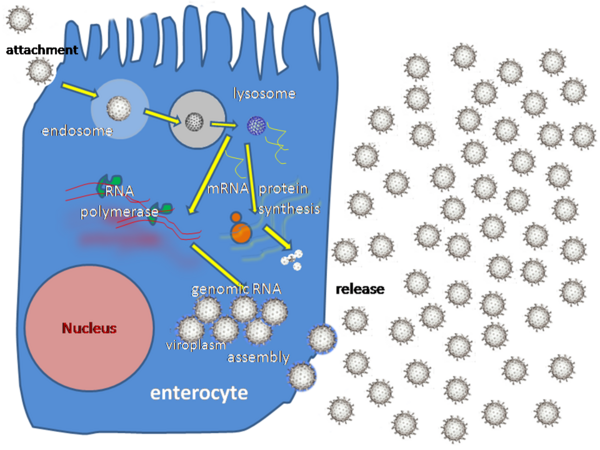 Ротавирусы реплицируются главным образом в кишечнике[37] и заражают энтероциты ворсинок тонкого кишечника, что приводит к структурным и функциональным изменениям эпителия[38]. Тройная белковая оболочка делает их устойчивыми к кислой среде желудка и пищеварительным ферментам в кишечнике.