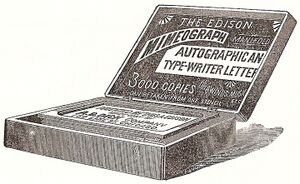 Название мимеографа происходит от др.-греч. μιμέομαι — подражаю и γράφω — пишу. Эту машину изобрёл американец Томас Альва Эдисон. Его мимеограф был сложным устройством, которое состояло из электрического пера и копировального ящика.[1]