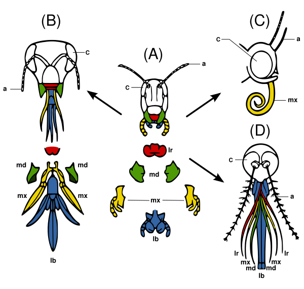 Ротовые части насекомых представляют результат эволюционного развития и видоизменения парных конечностей членистоногих. Исходным типом ротовых органов является грызущий ротовой аппарат, от которого в результате специализации развились множество других типов: лижущий, колюще-сосущий, трубчато-сосущий и другие.