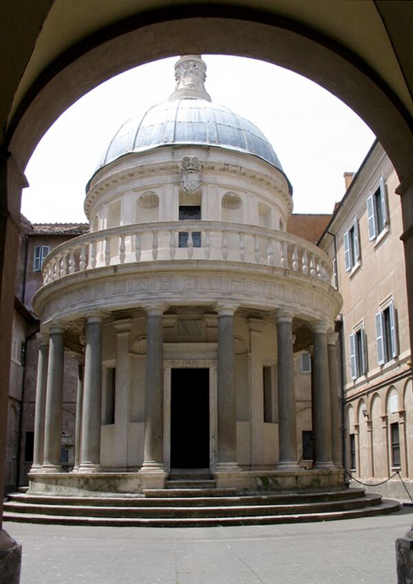 Классический образец ротонды в архитектуре римского классицизма XVI века — Темпьетто по проекту Д. Браманте на Яникульском холме в Риме (1502). Изображения ротондальных построек, которые разрабатывали Леонардо да Винчи и Браманте, можно видеть на картинах Пьетро Перуджино и Рафаэля Санти. Дальнейшим развитием этого типа с усложнением композиции является Вилла Ротонда Андреа Палладио близ Виченцы[6][7].