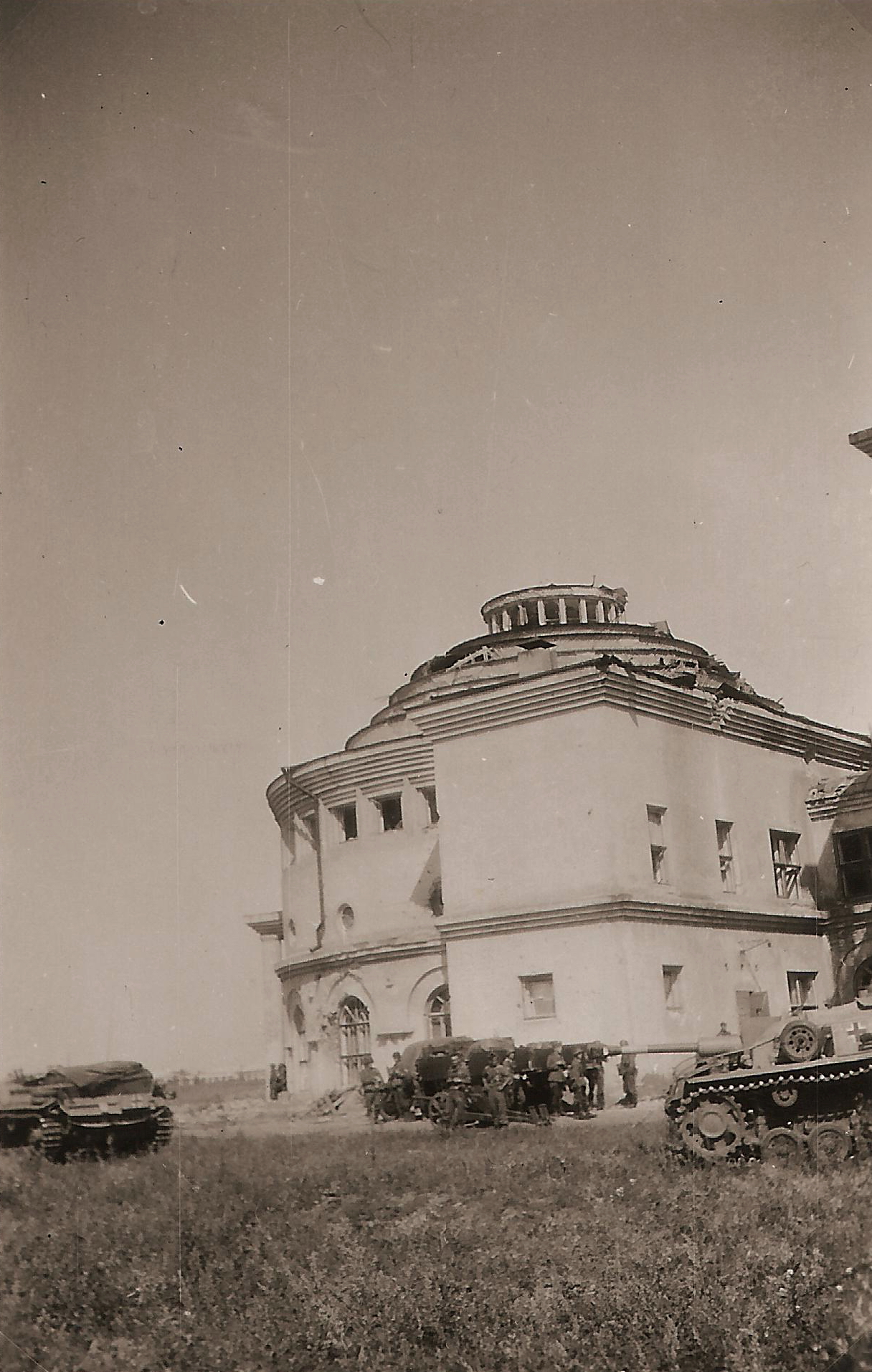 | Терапевтический корпус областной больницы в 1940 году. Ротонда на снимке слева. | Ротонда до войны. | Ротонда во время войны: немецкие войска у здания. |
