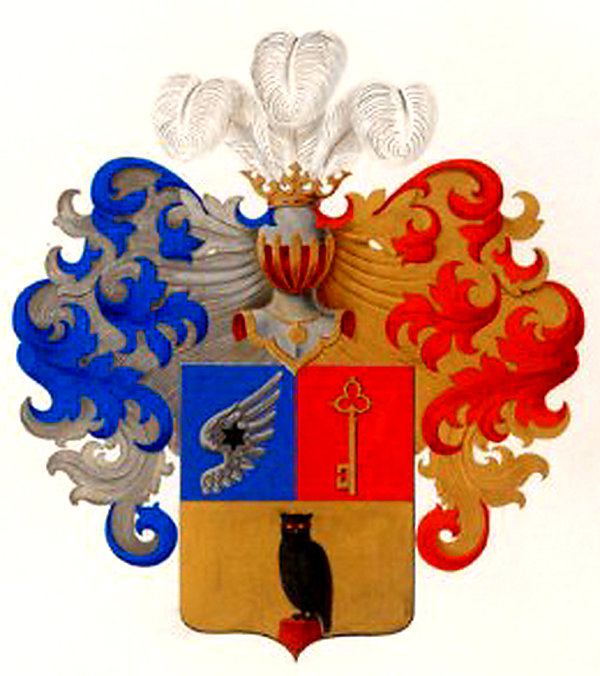 Щит полурассечен-пересечен. В первой, лазуревой части, серебряное орлиное крыло, обремененное черною о шести лучах звездою. Во второй, червлёной части, золотой опрокинутый ключ. В третьей, золотой части, на червлёном пне, чёрная, с червлёными глазами и языком сова.