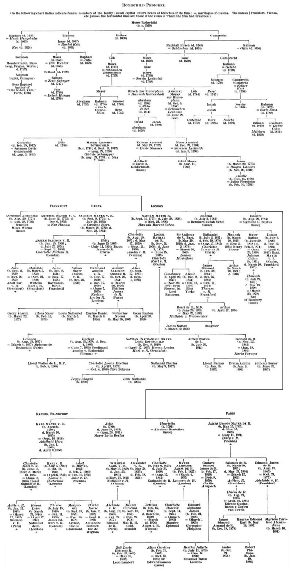 Завещание Майера Ротшильд говорило, что все важные посты в деле должны занимать только члены семьи, мужчины семьи должны заключать браки с двоюродными и троюродными сестрами, чтобы накопленное богатство осталось внутри семьи и служило общему делу. Лишь в конце XIX века почти все Ротшильды начали заключать браки за пределами семьи. Большинство семейств еврейских финансистов в Лондоне в XIX—XX веках были переплетены родственными связями[6].