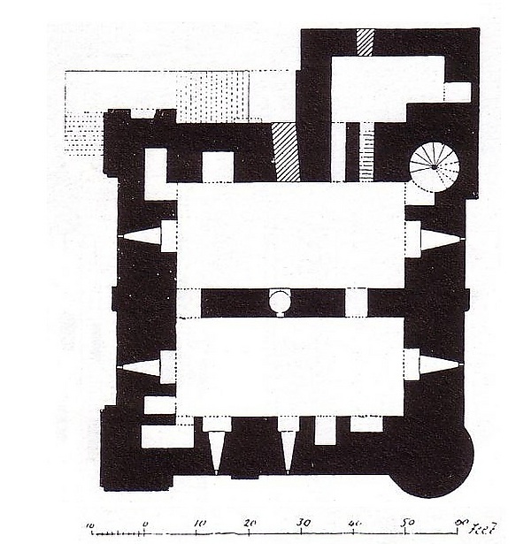Помещения донжона были разделены на отдельные зоны для титулованных особ, их свиты, и солдат[55]. Первый этаж использовался как хранилище. На втором этаже находилась лучшая комната замка с наиболее сложной отделкой, с высотой потолков 8,2 метра. На этом же этаже была часовня размером 8,5 на 4,6 метров. Третий этаж имел вторую часовню и здесь же был выход на крышу, а также, возможно, включал в себя дополнительные помещения[56].