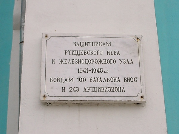 На здании вокзала Ртищево-I открыта мемориальная доска, посвящённая 100-му отдельному батальону ВНОС и 243-му ОЗАД.
