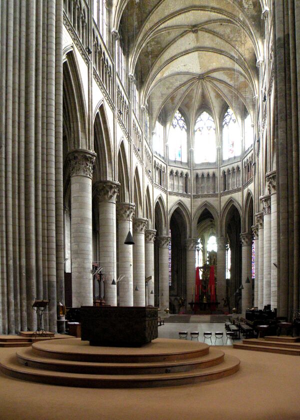 Самой древней частью готического собора является северная башня (башня Сен-Ромен), построенная в 1145 году. Она полностью выгорела 1 июня 1944 года после бомбардировок, от изначальной постройки остались лишь стены. Южная башня (Масляная башня) была построена в 1485 году. Неф был сооружён в 1200 году, когда существовавший романский неф обрушился в результате пожара. Единственный сохранившийся изначальный портал — северный, портал Иоанна Богослова, представляющий сцены из жизни Иоанна Богослова и Иоанна Предтечи. Он неоднократно реставрировался после 1769 года. Два других портала были сильно повреждены в XVI веке. Архиепископский дворец, составляющий с собором единый комплекс, является современником готического собора.