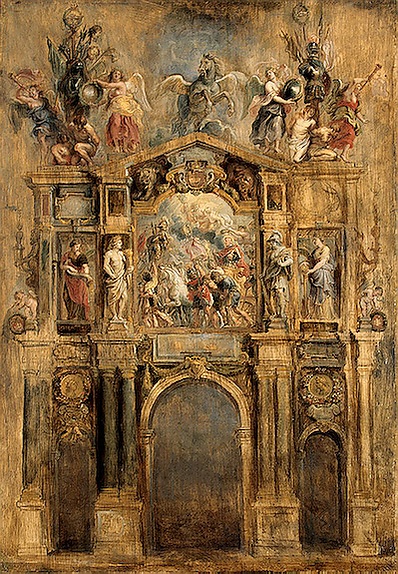 В 1634 году Рубенс получил крупнейший в своей карьере официальный заказ на украшение Антверпена в честь прибытия нового правителя Нидерландов — Фердинанда Австрийского. Церемония была назначена на 17 апреля 1635 года, и подготовка заняла более года. В распоряжение Рубенса предоставили всех городских ремесленников, включая каменщиков, маляров и штукатуров. Художник направил в Рим и Ломбардию агентов, которые копировали для него нужные архитектурные образцы. Рубенс спроектировал 5 триумфальных арок, 5 театров, несколько грандиозных портиков, включая 12-рядный, посвящённый 12 германским императорам. За оформление отвечали Якоб Йорданс, Корнелис де Вос, Эразм Квеллин III, Лукас Файдербе. Напряжённая работа привела к сильнейшему приступу подагры, и Рубенса возили в кресле на колёсиках[218]. Триумфальное шествие кардинала-инфанта длилось целый день, который закончился в соборе. Рубенс, прикованный к постели приступом, не смог принять участия в церемонии, но Фердинанд Австрийский лично нанёс ему визит домой. Ночью торжества продолжались при свете 300 бочек со смолой. За грандиозную феерию Рубенс был удостоен премии в 5600 флоринов, при том, что в оформление церемонии им было вложено 80 000 собственных средств. Чтобы немного сократить расходы, муниципалитет продал некоторые полотна брюссельскому двору[216].
