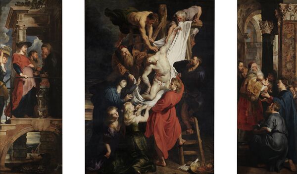 Триптих «Снятие с креста» для городского собора Антверпена был заказан Рубенсу в 1611 году антверпенской гильдией стрелков. Триптихи были традиционны для нидерландского искусства, однако Рубенс смело нарушил традицию, по которой на боковых створках изображались либо портреты заказчиков-донаторов, либо события, непосредственно связанные с сюжетом центральной части. Художник объединил в рамках одного произведения три разновременных события. На боковых створках показаны встреча Марии с Елизаветой и Обрезание Господне, которые решены в праздничных тонах. Евангельские герои облачены в элегантные наряды и выглядят как светские особы, это подчёркивается и сочетанием ярких насыщенных красок. Однако нарядная и праздничная атмосфера этих сцен контрастирует с центральной частью, поскольку демонстрирует лишь пролог к мученической смерти Спасителя. Рубенс объединил сцены начала жизни и её земного завершения. Напротив, в колорите центральной сцены преобладают белый, чёрный и красный тона. Используемая интенсивная светотень явно демонстрирует усвоение караваджистских приёмов и была избрана совершенно сознательно, чтобы сцена была хорошо видна в полумраке собора. Композиция центральной фигуры была выполнена под впечатлением античной скульптурной группы, изображающей Лаокоона с сыновьями, а падающая диагональ рук мёртвого Христа придавала сцене законченную безысходность и трагизм[111].