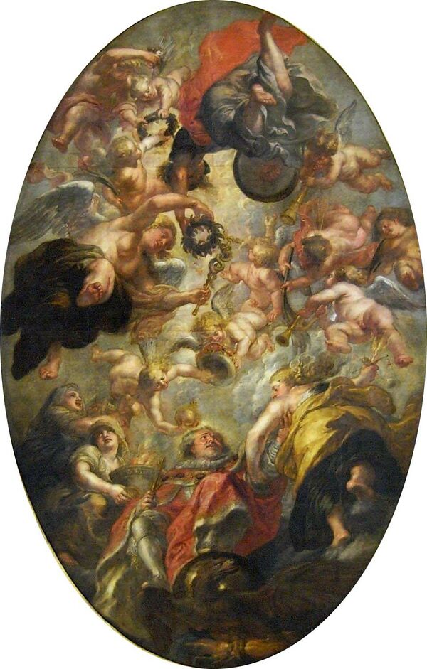В том же декабре 1627 года Рубенс попытался выйти на руководство Протестантской лиги, приняв в своей мастерской посланника Дании в Гааге Восбергена. Предложения Дании Рубенс также отправил Спиноле в Мадрид, рассчитывая добиться уступок от Голландии[182]. В известном смысле дом Рубенса превратился в «приёмную» Брюссельского двора: у него квартировали посланники Лотарингии и Англии перед официальными приёмами. Кроме того, многочисленные корреспонденты Рубенса по антикварной торговле позволяли вести обширную тайную переписку, в которой художник пользовался как минимум четырьмя разными шифрами[183]. Наиболее примечательно на этом фоне, что Рубенс не отказался от планов создания галереи Генриха IV и 27 января 1628 года сообщил аббату де Сент-Амбруазу, что приступил к работе над эскизами. Однако этот проект так и остался неосуществлённым[184].