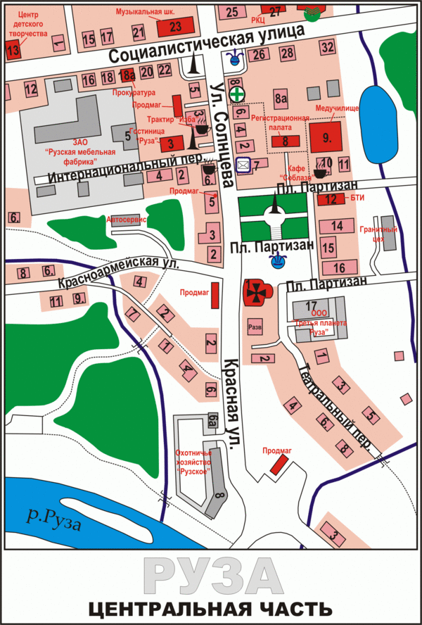 - с сельским поселением Старорузское (на юго-востоке, юге, юго-западе),
