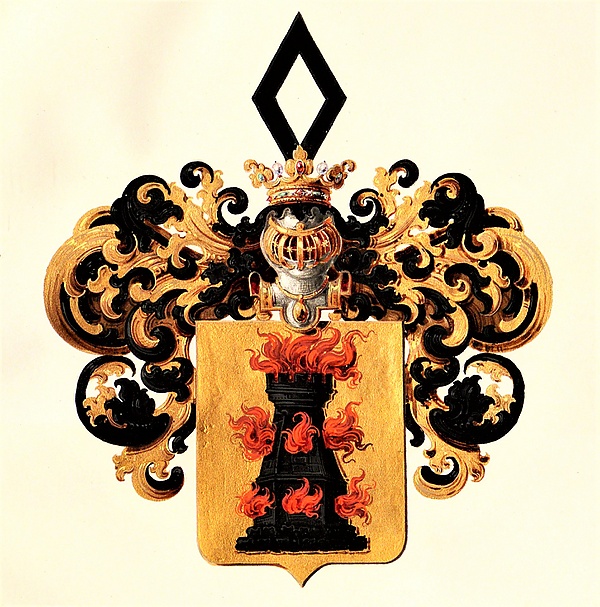 Описание герба: Выдержка из Дипломного сборника В золотом щите чёрная горящая доменная печь. Над щитом дворянский коронованный шлем. Нашлемник: чёрное пустое веретено. Намёт чёрный с золотом. |