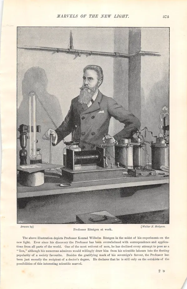С 1888 года Вильгельм Рентген возглавил кафедру физики в университете Вюрцбурга (Бавария), позже, в 1894 году, его избирают ректором этого университета[1]. Главное открытие в своей жизни — икс-излучение — он совершил, когда ему было 50 лет. При проведении экспериментов с трубкой Крукса, он установил, что из неё исходит неизвестное излучение, названное им впоследствии икс-лучами (X-лучи). Эксперименты Рентгена показали, что они возникают в месте столкновения катодных лучей с преградой внутри катодной трубки. Учёный сделал трубку специальной конструкции — антикатод был плоским, что обеспечивало интенсивный поток икс-лучей. Благодаря этой трубке (она впоследствии будет названа рентгеновской) физик в течение нескольких недель изучил и описал основные свойства ранее неизвестного излучения, которое позже получило название рентгеновского. Лучи имели способность проходить через различные материалы[1]. Он стал экспериментировать с различными предметами и установил, что они не проходят через свинец, и становятся непроницаемыми перед другими металлами, в зависимости от их плотности: «При этом бумага или дерево не поглощали лучи, а человеческая плоть поглощала их в очень небольшой степени»[2]. Английский физик Сильванус Томпсон, описывая работу немецкого коллеги писал: «Ничего не видно, пока неведомые до сих пор лучи, исходящие из трубки Крукса и проникающие сквозь картон, не упали на люминесцентный экран, обнаружив тем самым своё существование и сделав темноту видимой… Первооткрыватель, поместив свою руку между источником лучей и куском люминесцирующего картона, увидел кости руки в виде силуэта на экране. Великое открытие совершилось»[3]. Учёный установил, что излучение воздействуют на фотографические пластинки и стал использовать их для фиксации своих опытов[4].