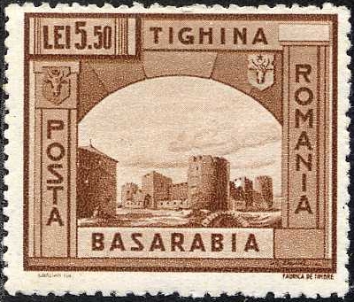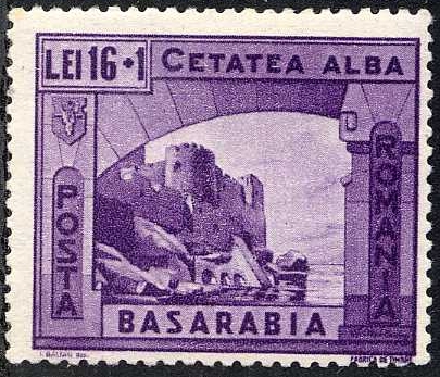 | Румынские почтовые марки времён Второй мировой войны с нанесёнными на них панорамами городов Бессарабии, которые даны в контексте «единой Румынии». Названия городов даны по-румынски Сверху вниз: Четатя-Албэ (Белгород-Днестровский), Сорока (Сороки), Тигина (Бендеры) |