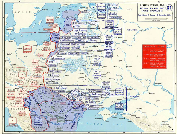 29 октября началась Будапештская операция, и военные действия перенеслись с территории Румынии в Венгрию. В боях в Венгрии наравне с советскими войсками принимало участие некоторое количество румынских войск (1-я и 4-я румынские армии), в том числе 1-й и 4-й румынские воздушные корпуса, прикреплённые ко 2-му Украинскому фронту, отдельный танковый полк и 1-я румынская добровольческая пехотная дивизия имени Т. Владимиреску[90] под командованием Николае Камбря и сформированная в 1943 году под Рязанью[91].