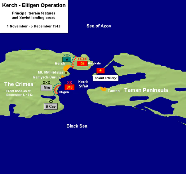 Пока у Сиваша шли бои, на Керченском полуострове действовала румынская кавалерия. 4 декабря немецко-румынские войска попытались переломить ситуацию на Керченском полуострове в свою пользу, предприняв контрнаступление. В нём приняла участие 6-я румынская кавалерийская дивизия, которой удалось временно изменить ситуацию на правом фланге в свою пользу. 7 декабря произошло генеральное наступление на советские войска, румынская кавалерия смогла овладеть ключевой позицией — высотой 37. 11 декабря румынские войска атаковали 318-ю советскую дивизию южнее Керчи, в результате нападения погибло 1100 красноармейцев, а кавалерия вышла к Керченскому проливу[80].