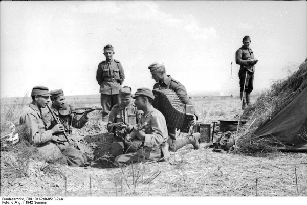 В январе 1942 года отдельные части 1-й румынской пехотной дивизии были переброшены к Харькову и принимали участие в боях. Румынские лыжные батальоны содействовали германской 17-й армии во время февральского наступления южнее города и возле Изюма. В начале марта лыжные батальоны были передислоцированы на 50 км южнее Харькова, где сражались вместе с венгерскими войсками. Один из венгерских эскадронов был временно подчинён румынской пехоте и 8 марта принял участие в наступлении. Отношения между румынскими и венгерскими войсками были сложными, поскольку Румыния и Венгрия имели серьёзные противоречия, однако операция прошла успешно. 28 марта румынские части были передислоцированы на западный берег реки Орлик, где заняла оборону[62].