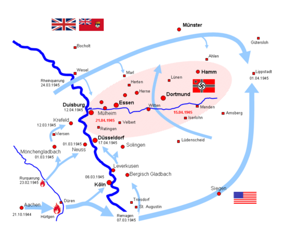 2 апреля американские войска начали ликвидацию окружённой группировки. 14 апреля войска 9-й и 1-й американских армий соединились у Хагена, тем самым расчленив немецкую группировку на две части. 15 апреля войска 1-й американской армии, расширив образовавшийся коридор, повернули на запад и восток, чтобы ускорить ликвидацию группировки. 17 апреля командующий группой армий «Б» фельдмаршал Вальтер Модель отдал приказ прекратить сопротивление и сам застрелился 21 апреля. В этот же день германские войска полностью прекратили сопротивление в Руре. В плен к союзникам попало около 317 тыс. немецких солдат и офицеров.