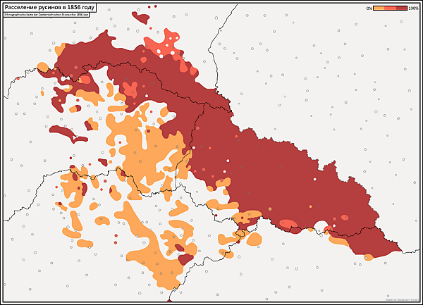 К середине XIX века этноним «русины» оставался широко распространённым в качестве самоназвания населения Карпатской Руси (Галиция, Буковина, Угорская Русь), чьи земли находились под владением Австро-Венгрии, а также населения севера Бессарабии, Волыни и Холмщины в Российской империи. До начала XIX века проблема национальной идентификации не поднималась, и населению края грозила полная утрата самостоятельности — в местах проживания русинов проводилась полонизация и мадьяризация. Но в 1848 году, во время венгерской революции, произошёл подъём национального самосознания в среде подкарпатской интеллигенции, началось распространение «русофильских» настроений в обществе. «Будители» заявляли о том, что русины это тот же народ, что и население Малороссии, а следовательно часть единого русского народа. Австро-венгерские власти, обеспокоенные венгерскими и польскими антиправительственными выступлениями, решили заручиться поддержкой русинов и оказывали поддержку их самоорганизации. Но австрийцы видели опасность в возрождении общерусского национального сознания, и за русинами был официально закреплён термин «Ruthenen» (рутены), который использовался в европейской практике для обозначения жителей Киевской Руси, Галицко-Волынского государства и впоследствии русинских воеводств Речи Посполитой начиная с XI века[56], в отличие от «Russen» — русских (российских подданных). Губернатор Галиции граф Стадион фон Вартгаузен заявил русинам, что они должны отречься от национального единства с остальной Русью и развивать свою культуру как самостоятельную.