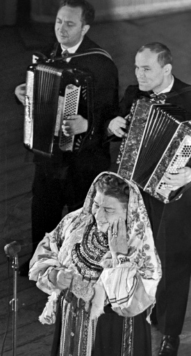 В начале войны в репертуаре Руслановой появилась песня «Валенки», ставшая её «визитной карточкой»[35]. Лидия Русланова давала концерты для солдат в течение всей войны. Выступать нередко приходилось в сложных условиях — под открытым небом в окопах, землянках, госпиталях.