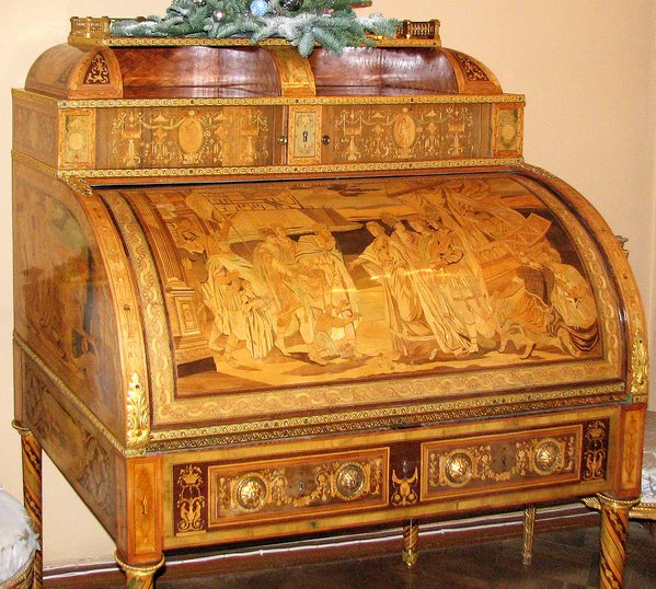 Поставщиком петербургского Двора в конце XVIII века был немецкий мастер Давид Рёнтген. В 1770 году он возглавил большую мастерскую в Нойвиде близ Кобленца (Рейнланд-Пфальц, западная Германия), затем работал в Париже. «Рёнтгеновская мебель» из красного дерева с маркетри и тонкими бронзовыми накладками была столь популярна, что её изготавливали и охтенские мастера, тоже именуя «рёнтгеновской». Давид Рёнтген приезжал в Петербург, сопровождая партии мебели, в 1784 и 1786 годах. Ныне эту мебель можно увидеть в Белом зале петербургского Эрмитажа[10].